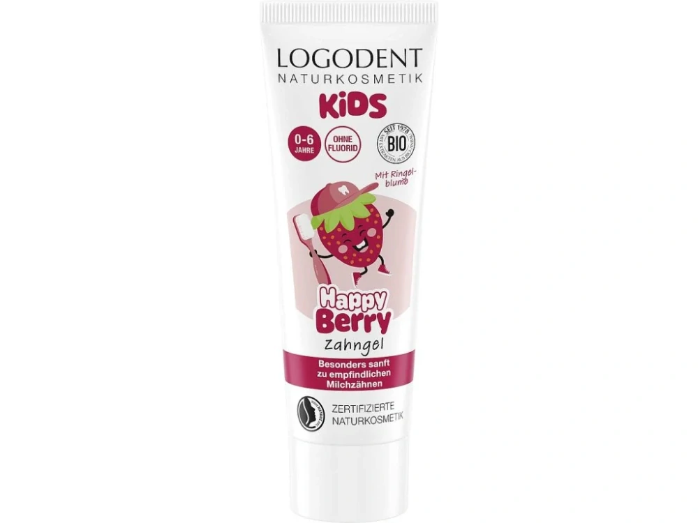 LOGODENT Dětské zubní gely byly přizpůsobeny speciálním potřebám dětské péče o zuby: Mírná organická mátová příchuť a přírodní organický jahodový extrakt tvoří příchuť LOGODENT Kids zubních gelů.